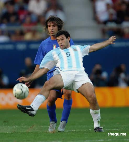 Javier Mascherano of Argentina in action with Andrea Pirlo of Italy during the men's football semifinal match on August 24, 2004 during the Athens 2004 Summer Olympic Games at Karaiskaki Stadium in Athens, Greece.