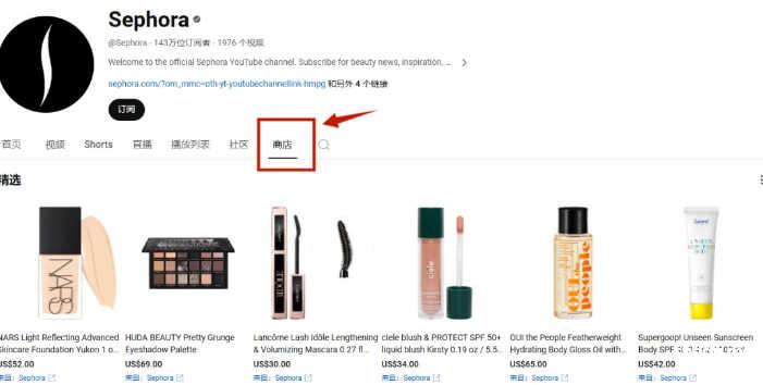 例如美妆品牌 Sephora,YouTube有143万粉丝,内容以美妆教程为主,品牌已经开通YouTube Shorts及商店专栏,其独立站域名与YouTube频道是同名,是一个典型的YouTube+独立站的完整案例。